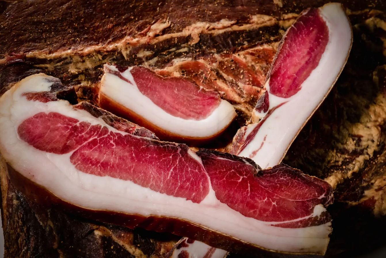 Das seit Jahrhunderten geschätzte und beliebte Veredelungsprodukt vereint alles, was auf keinem Tisch fehlen darf: eine mürbe Konsistenz mit zartem Biss, mild-salzigen Geschmack, abgerundet durch feine Noten von Knoblauch, Pfeffer, Wacholder und Rauch sowie Fett, das auf der Zunge zergeht.
